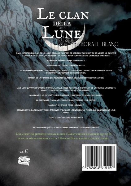 Tome 1/2 Onyx, héritier du Clan de la Lune, découvre auprès de son père Saphir et de sa meute, la dure vie d'un loup et les lois qui régissent la horde pour survivre dans un monde sans pitié. Comment préserver son territoire ? Comment protéger les plus faibles ? De nombreux dangers les guettent : les pumas, les lynx, les ours et les hommes dont ils redoutent le pouvoir de destruction. Au sein de la fratrie, des rivalités éclatent. Chacun doit trouver sa voie. Mais lorsqu' Onyx s'éprend d'Opale, la fille aînée de Béryl, roi du Clan de la Source, une meute rivale, les choses se compliquent sérieusement. D'autant plus qu'une terrible menace plane sur l'ensemble des loups. La puissante chamane les aidera à accomplir leur destin. Sauront ils s'unir pour survivre ? Arriveront-ils à surmonter les épreuves et déjouer les nombreux pièges qui jalonneront leur chemin ? Tant d'embûches les attendent ! Et dans leur quête, plane l'ombre terrifiante du grand grizzli.
