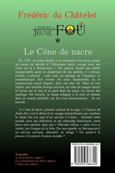 Le Cône de nacre, volume 1 de la saga L'Épopée du Jeune fou est un roman épique et visionnaire. C'est le début d'un voyage extraordinaire qui conduira le Jeune fou (ou pas) d'un univers à l'autre... Par sauvegarde, se fabrique-t-il un univers onirique, alternatif, en refuge ? Ou a-t-il le pouvoir d'explorer d'autres mondes ?