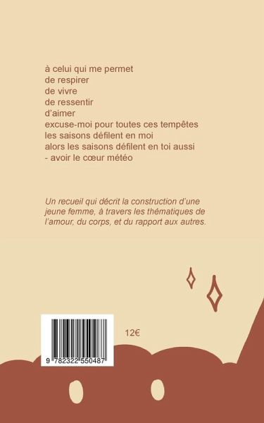 à celui qui me permet de respirer de vivre de ressentir d'aimer excuse-moi pour toutes ces tempêtes les saisons défilent en moi alors les saisons défilent en toi aussi - avoir le coeur météo Un recueil qui décrit la construction d'une jeune femme, à travers les thématiques de l'amour, du corps et du rapport aux autres.