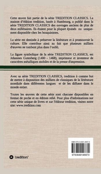 Cette uvre (édition relié) fait partie de la série TREDITION CLASSICS. La maison d édition tredition, basée à Hambourg, a publié dans la série TREDITION CLASSICS des ouvrages anciens de plus de deux millénaires. Ils étaient pour la plupart épuisés ou uniquement disponible chez les bouquinistes. La série est destinée à préserver la littérature et à promouvoir la culture. Avec sa série TREDITION CLASSICS, tredition à comme but de mettre à disposition des milliers de classiques de la littérature mondiale dans différentes langues et de les diffuser dans le monde entier.