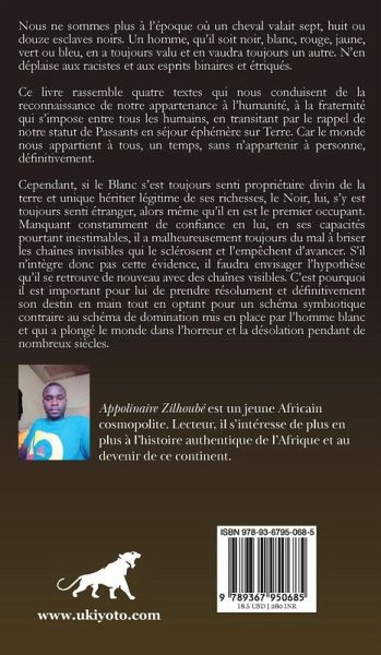 Nous ne sommes plus à l'époque où un cheval valait sept, huit ou douze esclaves noirs. Un homme, qu'il soit noir, blanc, rouge, jaune, vert ou bleu, en a toujours valu et en vaudra toujours un autre. N'en déplaise aux racistes et aux esprits binaires et étriqués. Ce livre rassemble quatre textes qui nous conduisent de la reconnaissance de notre appartenance à l'humanité, à la fraternité qui s'impose entre tous les humains, en transitant par le rappel de notre statut de Passants en séjour éphémère sur Terre. Car le monde nous appartient à tous, un temps, sans n'appartenir à personne, définitivement. Cependant, si le Blanc s'est toujours senti propriétaire divin de la terre et unique héritier légitime de ses richesses, le Noir, lui, s'y est toujours senti étranger, alors même qu'il en est le premier occupant. Manquant constamment de confiance en lui, en ses capacités pourtant inestimables, il a malheureusement toujours du mal à briser les chaînes invisibles qui le sclérosent et l'empêchent d'avancer. S'il n'intègre donc pas cette évidence, il faudra envisager l'hypothèse qu'il se retrouve de nouveau avec des chaînes visibles. C'est pourquoi il est important pour lui de prendre résolument et définitivement son destin en main tout en optant pour un schéma symbiotique contraire au schéma de domination mis en place par l'homme blanc et qui a plongé le monde dans l'horreur et la désolation pendant de nombreux siècles