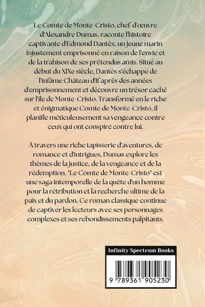 Le Comte de Monte-Cristo, chef-d'¿uvre d'Alexandre Dumas, raconte l'histoire captivante d'Edmond Dantès, un jeune marin injustement emprisonné en raison de l'envie et de la trahison de ses prétendus amis. Situé au début du XIXe siècle, Dantès s'échappe de l'infâme Château d'If après des années d'emprisonnement et découvre un trésor caché sur l'île de Monte-Cristo. Transformé en le riche et énigmatique Comte de Monte-Cristo, il planifie méticuleusement sa vengeance contre ceux qui ont conspiré contre lui. À travers une riche tapisserie d'aventures, de romance et d'intrigues, Dumas explore les thèmes de la justice, de la vengeance et de la rédemption. "Le Comte de Monte-Cristo" est une saga intemporelle de la quête d'un homme pour la rétribution et la recherche ultime de la paix et du pardon. Ce roman classique continue de captiver les lecteurs avec ses personnages complexes et ses rebondissements palpitants.
