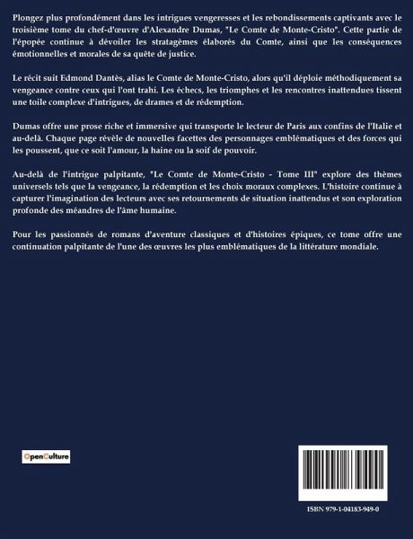 Plongez plus profondément dans les intrigues vengeresses et les rebondissements captivants avec le troisième tome du chef-d'¿uvre d'Alexandre Dumas, "Le Comte de Monte-Cristo". Cette partie de l'épopée continue à dévoiler les stratagèmes élaborés du Comte, ainsi que les conséquences émotionnelles et morales de sa quête de justice. Le récit suit Edmond Dantès, alias le Comte de Monte-Cristo, alors qu'il déploie méthodiquement sa vengeance contre ceux qui l'ont trahi. Les échecs, les triomphes et les rencontres inattendues tissent une toile complexe d'intrigues, de drames et de rédemption. Dumas offre une prose riche et immersive qui transporte le lecteur de Paris aux confins de l'Italie et au-delà. Chaque page révèle de nouvelles facettes des personnages emblématiques et des forces qui les poussent, que ce soit l'amour, la haine ou la soif de pouvoir. Au-delà de l'intrigue palpitante, "Le Comte de Monte-Cristo - Tome III" explore des thèmes universels tels que la vengeance, la rédemption et les choix moraux complexes. L'histoire continue à capturer l'imagination des lecteurs avec ses retournements de situation inattendus et son exploration profonde des méandres de l'âme humaine. Pour les passionnés de romans d'aventure classiques et d'histoires épiques, ce tome offre une continuation palpitante de l'une des ¿uvres les plus emblématiques de la littérature mondiale.