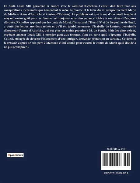 En 1628, Louis XIII gouverne la France avec le cardinal Richelieu. Celuici doit faire face aux conspirations incessantes que fomentent la mère, la femme et le frère du roi (respectivement Marie de Médicis, Anne d'Autriche et Gaston d'Orléans). Le problème est que le roi, d'une santé fragile et n'ayant aucun goût pour sa femme, est toujours sans descendance. Grâce à son réseau d'espions dévoués, Richelieu apprend que le comte de Moret, fils naturel d'Henri IV et de Jacqueline de Bueil, a porté des lettres aux deux reines et qu'il est tombé amoureux d'Isabelle de Lautrec, demoiselle d'honneur d'Anne d'Autriche, qui est plus ou moins promise à M. de Pontis. Mais les deux reines, espérant amener Louis XIII à prendre goût aux femmes, font en sorte qu'il s'éprenne d'Isabelle. Celleci, effrayée de devenir l'instrument d'une intrigue, demande protection au cardinal. Ce dernier la renvoie auprès de son père à Mantoue et lui donne pour escorte le comte de Moret qu'il décide à ne plus conspirer...