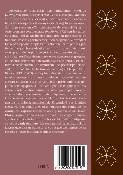 Personnalité inclassable mais attachante, Nikolaus Ludwig von Zinzendorf (1700-1760) a marqué l'histoire du protestantisme allemand et celui des nombreuses nations vers lesquelles il envoya des évangélistes moraves. Son nom reste en effet inséparable de celui d'Herrnout, cette première communauté fondée en 1727 sur les terres du comte, qui accueillit des immigrés en provenance de Bohême, chassés par la persécution religieuse. Zinzendorf fut à son époque amplement calomnié, tant par les piétistes que par les scolastiques, qui lui reprochaient soit sa trop grande largeur d'esprit, soit son mysticisme ; tandis qu'aujourd'hui, de manière assez racoleuse et grégaire, on célèbre volontiers son avance sur son temps, en matière d'{oe}cuménisme, de féminisme, de préoccupation sociale... En réalité, la lecture de sa biographie par Félix Bovet (1824-1903) --- la plus détaillée qui existe ---, nous montre surtout un homme totalement absorbé par son christocentrisme : s'il ne veut pas entrer dans des disputes théologiques, s'il ne veut pas se couper d'autres dénominations chrétiennes, ce n'est point par manque de conviction personnelle, mais uniquement par souci de faire avancer la cause de son Maître. Savoir dans quelle mesure la riche imagination de Zinzendorf, ses facultés poétiques peu communes (il a composé des centaines de cantiques) exprimaient la volonté personnelle de Jésus-Christ régnant dans les cieux, reste une énigme ; encore que les fruits saints et durables de l'activité prodigieuse de cet organisateur-né, laissent penser qu'entrant dans la présence de son Sauveur, il eut la joie d'entendre de sa bouche : « Bien fait, bon et fidèle serviteur !» Ce livre ThéoTeX reproduit l'édition originale de 1865.