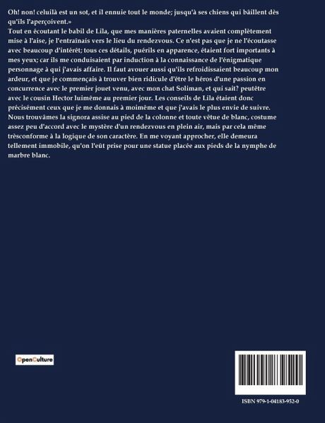 Oh! non! celuilà est un sot, et il ennuie tout le monde; jusqu'à ses chiens qui bâillent dès qu'ils l'aperçoivent.» Tout en écoutant le babil de Lila, que mes manières paternelles avaient complètement mise à l'aise, je l'entraînais vers le lieu du rendezvous. Ce n'est pas que je ne l'écoutasse avec beaucoup d'intérêt; tous ces détails, puérils en apparence, étaient fort importants à mes yeux; car ils me conduisaient par induction à la connaissance de l'énigmatique personnage à qui j'avais affaire. Il faut avouer aussi qu'ils refroidissaient beaucoup mon ardeur, et que je commençais à trouver bien ridicule d'être le héros d'une passion en concurrence avec le premier jouet venu, avec mon chat Soliman, et qui sait? peutêtre avec le cousin Hector luimême au premier jour. Les conseils de Lila étaient donc précisément ceux que je me donnais à moimême et que j'avais le plus envie de suivre. Nous trouvâmes la signora assise au pied de la colonne et toute vêtue de blanc, costume assez peu d'accord avec le mystère d'un rendezvous en plein air, mais par cela même trèsconforme à la logique de son caractère. En me voyant approcher, elle demeura tellement immobile, qu'on l'eût prise pour une statue placée aux pieds de la nymphe de marbre blanc.