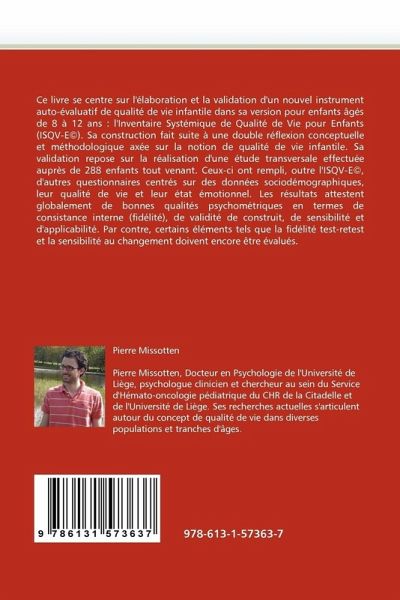Ce livre se centre sur l'élaboration et la validation d'un nouvel instrument auto-évaluatif de qualité de vie infantile dans sa version pour enfants âgés de 8 à 12 ans : l'Inventaire Systémique de Qualité de Vie pour Enfants (ISQV-E©). Sa construction fait suite à une double réflexion conceptuelle et méthodologique axée sur la notion de qualité de vie infantile. Sa validation repose sur la réalisation d'une étude transversale effectuée auprès de 288 enfants tout venant. Ceux-ci ont rempli, outre l'ISQV-E©, d'autres questionnaires centrés sur des données sociodémographiques, leur qualité de vie et leur état émotionnel. Les résultats attestent globalement de bonnes qualités psychométriques en termes de consistance interne (fidélité), de validité de construit, de sensibilité et d'applicabilité. Par contre, certains éléments tels que la fidélité test-retest et la sensibilité au changement doivent encore être évalués.
