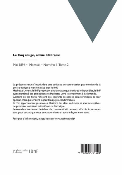 Le Coq rouge: revue littéraire / [comité de rédaction: Louis Delattre, Eugène Demolder, Georges Eekhoud, Hubert Krains, Maurice Maeterlinck, Francis Nautet, Émile Verhaeren] Date de l'édition originale: 1896-05 La présente revue s'inscrit dans une politique de conservation patrimoniale de la presse française mise en place avec la BnF. Hachette Livre et la BnF proposent ainsi un catalogue de titres indisponibles, la BnF ayant numérisé ces publications et Hachette Livre les imprimant à la demande. Certains de ces titres reflètent des courants de pensée caractéristiques de leur époque, mais qui seraient aujourd'hui jugés condamnables. Ils n'en appartiennent pas moins à l'histoire des idées en France et sont susceptibles de présenter un intérêt scientifique ou historique. Le sens de notre démarche éditoriale consiste ainsi à permettre l'accès à ces revues sans pour autant que nous en cautionnions en aucune façon le contenu. Pour plus d'informations, rendez-vous sur www.hachettebnf.fr