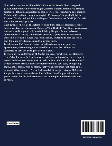 Nous étions descendus à l'hôtel de la Victoire. M. Martin Zir est le type du parfait hôtelier italien: homme de goût, homme d'esprit, antiquaire distingué, amateur de tableaux, convoiteur de chinoiseries, collectionneur d'autographes, M. Martin Zir est tout, excepté aubergiste. Cela n'empêche pas l'hôtel de la Victoire d'être le meilleur hôtel de Naples. Comment cela se fait-il? Je n'en sais rien. Dieu est parce qu'il est. C'est qu'aussi l'hôtel de la Victoire est situé d'une manière ravissante: vous ouvrez une fenêtre, vous voyez Chiaja, la Villa-Reale, le Pausilippe: vous ouvrez une autre, voilà le golfe, et à l'extrémité du golfe, pareille à un vaisseau éternellement à l'ancre, la bleuâtre et poétique Caprée; vous en ouvrez une troisième, c'est Sainte-Lucie avec ses mellonari, ses fruits de mer, ses cris de tous les jours, ses illuminations de toutes les nuits. Les chambres d'où l'on voit toutes ces belles choses ne sont point des appartemens; ce sont des galeries de tableau, ce sont des cabinets de curiosités, ce sont des boutiques de bric-à-brac. Je crois que ce qui détermine M. Martin Zir à recevoir chez lui des étrangers, c'est d'abord le désir de leur faire voir les trésors qu'il possède; puis il loge et nourrit les hôtes par circonstance. A la fin de leur séjour à la Vittoria, un total de leur dépense arrive, c'est vrai: ce total se monte à cent écus, à vingt-cinq louis, à mille francs, plus ou moins, c'est vrai encore; mais c'est parce qu'ils demandent leur compte. S'ils ne le demandaient pas, je crois que M. Martin Zir, perdu dans la contemplation d'un tableau, dans l'appréciation d'une porcelaine ou dans le déchiffrement d'un autographe, oublierait de le leur envoyer.