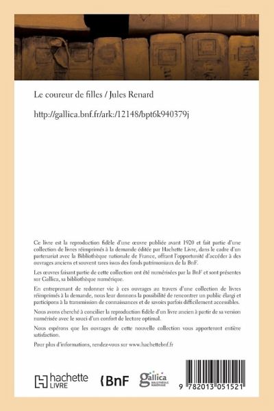 Le coureur de filles / Jules Renard Date de l'édition originale: 1894 Collection: Auteurs célèbres; 258 Le présent ouvrage s'inscrit dans une politique de conservation patrimoniale des ouvrages de la littérature Française mise en place avec la BNF. HACHETTE LIVRE et la BNF proposent ainsi un catalogue de titres indisponibles, la BNF ayant numérisé ces oeuvres et HACHETTE LIVRE les imprimant à la demande. Certains de ces ouvrages reflètent des courants de pensée caractéristiques de leur époque, mais qui seraient aujourd'hui jugés condamnables. Ils n'en appartiennent pas moins à l'histoire des idées en France et sont susceptibles de présenter un intérêt scientifique ou historique. Le sens de notre démarche éditoriale consiste ainsi à permettre l'accès à ces oeuvres sans pour autant que nous en cautionnions en aucune façon le contenu. Pour plus d'informations, rendez-vous sur www.hachettebnf.fr