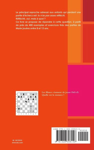 Le cours d'échecs de Marie: huit cours d'échecs pour aider les enfants à mieux réfléchir, pour ne plus rater un mat, perdre une pièce bêtement ou faire des erreurs de calcul. Les exercices sont tirés des parties jouées par Marie entre 8 et 13 ans.