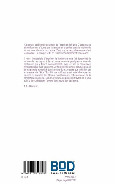 [Ce roman] est l'histoire d'amour de l'esprit et de l'âme. C'est un vase alchimique qui s'ouvre par la lecture et organise dans le monde du lecteur une vibrante synchronie.C'est une remarquable oeuvre d'art visionnaire. Quiconque le lit en ressort inévitablement transformé.Il m'est impossible d'exprimer la luminosité que j'ai éprouvéeà la lecture de ces pages, à la rencontre de cette prodigieuse force du sentiment qui y fleurit naturellement, avec et par la conscience mythopoétique qui s'y exprime. Cette histoire d'amour est une infusion de magistrale humanité, aussi proche du texte sacré que la fiction est en mesure de l'être. Son flôt narratif est aussi inévitable que les saisons ou la danse des étoiles. Son thème est celui du secret de la compétence de l'être. La lumière du soleil perce au travers de la voix qui s'y écrit, chassant l'ombre dans toute son épaisseur.A.A. Attanasio.