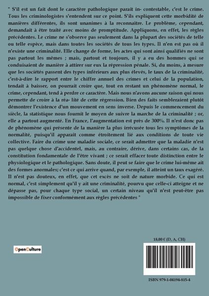 " S'il est un fait dont le caractère pathologique parait in- contestable, c'est le crime. Tous les criminologistes s'entendent sur ce point. S'ils expliquent cette morbidité de manières différentes, ils sont unanimes à la reconnaître. Le problème, cependant, demandait à être traité avec moins de promptitude. Appliquons, en effet, les règles précédentes. Le crime ne s'observe pas seulement dans la plupart des sociétés de telle ou telle espèce, mais dans toutes les sociétés de tous les types. Il n'en est pas où il n'existe une criminalité. Elle change de forme, les actes qui sont ainsi qualifiés ne sont pas partout les mêmes ; mais, partout et toujours, il y a eu des hommes qui se conduisaient de manière à attirer sur eux la répression pénale. Si, du moins, à mesure que les sociétés passent des types inférieurs aux plus élevés, le taux de la criminalité, c'est-à-dire le rapport entre le chiffre annuel des crimes et celui de la population, tendait à baisser, on pourrait croire que, tout en restant un phénomène normal, le crime, cependant, tend à perdre ce caractère. Mais nous n'avons aucune raison qui nous permette de croire à la réa- lité de cette régression. Bien des faits sembleraient plutôt démontrer l'existence d'un mouvement en sens inverse. Depuis le commencement du siècle, la statistique nous fournit le moyen de suivre la marche de la criminalité ; or, elle a partout augmenté. En France, l'augmentation est près de 300%. Il n'est donc pas de phénomène qui présente de la manière la plus irrécusée tous les symptômes de la normalité, puisqu'il apparaît comme étroitement lié aux conditions de toute vie collective. Faire du crime une maladie sociale, ce serait admettre que la maladie n'est pas quelque chose d'accidentel, mais, au contraire, dérive, dans certains cas, de la constitution fondamentale de l'être vivant ; ce serait effacer toute distinction entre le physiologique et le pathologique. Sans doute, il peut se faire que le crime lui-même ait des formes anormales; c'est ce qui arrive quand, par exemple, il atteint un taux exagéré. Il n'est pas douteux, en effet, que cet excès ne soit de nature morbide. Ce qui est normal, c'est simplement qu'il y ait une criminalité, pourvu que celle-ci atteigne et ne dépasse pas, pour chaque type social, un certain niveau qu'il n'est peut-être pas impossible de fixer conformément aux règles précédentes "