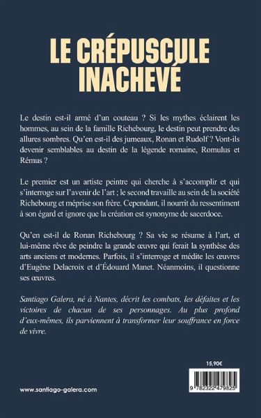Le destin est-il armé d'un couteau? Si les mythes éclairent les hommes, au sein de la famille Richebourg, le destin peut prendre des allures sombres. Qu'en est-il des jumeaux, Ronan et Rudolf? Vont-ils devenir semblables au destin de la légende romaine, Romulus et Rémus? Le premier est un artiste peintre qui cherche à s'accomplir et qui s'interroge sur l'avenir de l'art; le second travaille au sein de la société Richebourg et méprise son frère. Cependant, il nourrit du ressentiment à son égard et ignore que la création est synonyme de sacerdoce. Qu'en est-il de Ronan Richebourg? Sa vie se résume à l'art, et lui-même rêve de peindre la grande oeuvre qui ferait la synthèse des arts anciens et modernes. Parfois, il s'interroge sur les oeuvres d'Eugène Delacroix et d'Edouard Manet. Néanmoins, il questionne ses oeuvres.