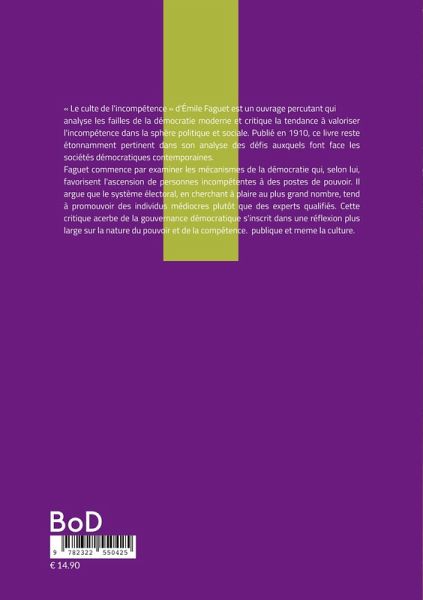 « Le culte de l'incompétence » d'Émile Faguet est un ouvrage percutant qui analyse les failles de la démocratie moderne et critique la tendance à valoriser l'incompétence dans la sphère politique et sociale. Publié en 1910, ce livre reste étonnamment pertinent dans son analyse des défis auxquels font face les sociétés démocratiques contemporaines. Faguet commence par examiner les mécanismes de la démocratie qui, selon lui, favorisent l'ascension de personnes incompétentes à des postes de pouvoir. Il argue que le système électoral, en cherchant à plaire au plus grand nombre, tend à promouvoir des individus médiocres plutôt que des experts qualifiés. Cette critique acerbe de la gouvernance démocratique s'inscrit dans une réflexion plus large sur la nature du pouvoir et de la compétence. L'auteur explore ensuite les conséquences de ce « culte de l'incompétence » sur différents aspects de la société. Il analyse comment cette valorisation de la médiocrité affecte l'éducation, l'administration publique et meme la culture. Faguet dresse un portrait sans concession d'une société où l'expertise est dévalorisée au profit d'une fausse égalité. Ce livre s'inscrit naturellement dans les catégories « Philosophie politique », « Critique sociale » et « Essais politiques » sur les plateformes de vente en ligne. Faguet y déploie une analyse incisive, alliant rigueur intellectuelle et style mordant pour décortiquer les travers de la société démocratique. « Le culte de l'incompétence » ne se contente pas d'etre une simple critique ; c'est un appel à la réforme et à la réflexion sur les fondements de notre système politique. Faguet propose des pistes pour remédier à cette situation, plaidant pour une méritocratie véritable et une valorisation de l'expertise dans la gestion des affaires publiques. L'ouvrage aborde également des questions cruciales sur la nature de la compétence et de l'autorité. Faguet s'interroge sur les critères qui devraient guider le choix des dirigeants et sur la façon dont une société peut cultiver et reconnaitre l'excellence plutot que la médiocrité.