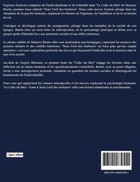 Explorez l'univers complexe de l'individualisme et de l'identité dans "Le Culte du Moi" de Maurice Barrès, premier tome intitulé "Sous l¿¿il des barbares". Dans cette ¿uvre, l'auteur plonge dans les méandres de la psyché humaine, explorant les thèmes de l'égoïsme, de l'ambition et de la recherche de soi. L'intrigue se développe autour du protagoniste, plongé dans les tumultes de la société de son époque. Barrès tisse un récit riche en introspection, où le personnage principal se débat avec sa propre quête d'identité face aux pressions sociales et aux défis extérieurs. La plume subtile de Maurice Barrès offre une profondeur psychologique, capturant les nuances des pensées intimes et des conflits intérieurs. "Sous l¿¿il des barbares" est bien plus qu'une simple narration ; c'est une exploration profonde des forces qui façonnent l'individu et de la tension entre le moi et la société. Au-delà de l'aspect littéraire, ce premier tome du "Culte du Moi" engage les lecteurs dans une réflexion sur la nature humaine et les questionnements existentiels. Barrès, avec sa prose élégante, invite à une introspection profonde, remettant en question les normes sociales et interrogeant les fondements de l'individualité. Pour ceux qui apprécient les romans introspectifs et les ¿uvres explorant la psychologie humaine, "Le Culte du Moi - Tome I: Sous l¿¿il des barbares" offre une lecture stimulante et enrichissante.