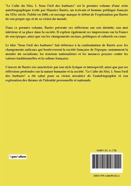 "Le Culte du Moi, 1. Sous l'¿il des barbares" est le premier volume d'une série autobiographique écrite par Maurice Barrès, un écrivain et homme politique français du XIXe siècle. Publié en 1888, cet ouvrage marque le début de l'exploration par Barrès de son propre ego et de sa vision du monde. Dans ce premier volume, Barrès présente ses réflexions sur son identité, son moi intérieur et sa place dans la société. Il explore également ses impressions sur la France de son époque, ainsi que sur les changements sociaux, politiques et culturels en cours. Le titre "Sous l'¿il des barbares" fait référence à la confrontation de Barrès avec les changements radicaux qui bouleversent la société française de l'époque, notamment la montée du socialisme, les tensions nationalistes et les menaces perçues contre les valeurs traditionnelles et la culture française. L'¿uvre de Barrès est caractérisée par son style lyrique et introspectif, ainsi que par ses réflexions profondes sur la nature humaine et la société. "Le Culte du Moi, 1. Sous l'¿il des barbares" a été salué pour sa vision novatrice de l'autobiographie et son exploration des thèmes de l'identité personnelle et nationale.