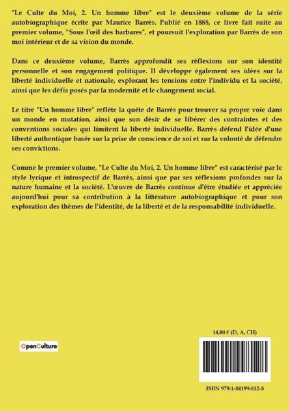 "Le Culte du Moi, 2. Un homme libre" est le deuxième volume de la série autobiographique écrite par Maurice Barrès. Publié en 1888, ce livre fait suite au premier volume, "Sous l'¿il des barbares", et poursuit l'exploration par Barrès de son moi intérieur et de sa vision du monde. Dans ce deuxième volume, Barrès approfondit ses réflexions sur son identité personnelle et son engagement politique. Il développe également ses idées sur la liberté individuelle et nationale, explorant les tensions entre l'individu et la société, ainsi que les défis posés par la modernité et le changement social. Le titre "Un homme libre" reflète la quête de Barrès pour trouver sa propre voie dans un monde en mutation, ainsi que son désir de se libérer des contraintes et des conventions sociales qui limitent la liberté individuelle. Barrès défend l'idée d'une liberté authentique basée sur la prise de conscience de soi et sur la volonté de défendre ses convictions. Comme le premier volume, "Le Culte du Moi, 2. Un homme libre" est caractérisé par le style lyrique et introspectif de Barrès, ainsi que par ses réflexions profondes sur la nature humaine et la société. L'¿uvre de Barrès continue d'être étudiée et appréciée aujourd'hui pour sa contribution à la littérature autobiographique et pour son exploration des thèmes de l'identité, de la liberté et de la responsabilité individuelle.