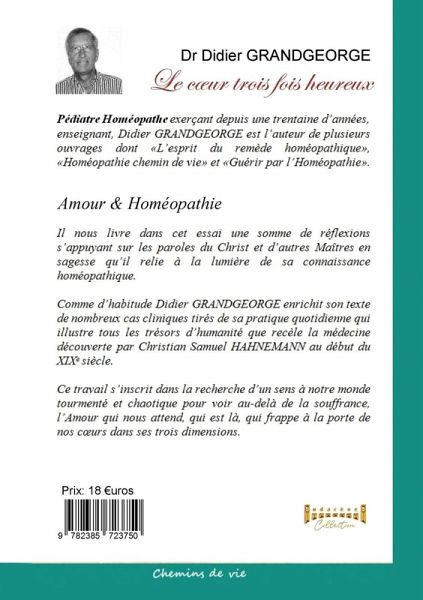 Une vision large et généreuse de l'homéopathie. Pédiatre Homéopathe, Didier Grandgeorge s'appuie sur une longue pratique de l'homéopathie pour plonger dans l'univers fécond de l'Amour, guide de nos chemins empruntés. Sa grande expérience l'amène à rencontrer de nombreux cas à traiter, dont il jalonne son texte par des histoires et des exemples vécus. A la lumière de l'évangile, qu'il cite comme repère de vie, il nous conduit sur la route de chacun en nous signalant les étapes à franchir. Moi, toi, eux ; psore, sicose, luèse ; je nous eux; les trois dimensions. A l'image de Françoise Dolto, il se risque à démontrer la force de l'homéopathie pour résoudre les "mal a dit" de notre société. Il ose prendre la plume pour la quatrième fois afin de nous accompagner par son savoir. Par des interventions simples et concrètes, l'homéopathe donne tout son sens à la vie par ses regards adaptés. Extraits tirés de la Bible, posologie à appliquer, mots donnés, le docteur Didier Grandgeorge signe là son livre le plus ouvert, celui qui nous révèle le visible invisible. Pourquoi ne pas aborder leurs lectures avec ce nouvel outil : l'homéopathie ? Un livre en trois dimensions : - Le regard de l'évangile - Le regard de l'homéopathe - Le regard de l'auteur, Didier Grandgeorge Un ouvrage fondateur sur les bienfaits de l'homéopathie. EXTRAIT 8 avril 2004 En route vers le JAPON En 1810, à Côthen, Christian Samuel Hahnemann signe la préface de l'organon de l'art de guérir, le pilier de la doctrine homéopathique. Il termine en disant que ' seul l'homme sans préjugé armé d'un zèle intrépide peut devenir apte à une telle vocation, la plus sacrée d'entre toute pour exercer ce véritable Art de guérir. Le maître d'un tel art, en aidant les créatures du tout puissant à conserver la santé et la vie, confine presque à la divinité, s'approchant ainsi du créateur suprême, dont la bénédiction, son devoir étant accompli, rend son coeur trois fois heureux '. À PROPOS DE L'AUTEUR Didier Grandgeorge a été psychiatre, puis pédiatre avant de se tourner vers l'homéopathie. Fondateur de l'EHFS , "Ecole Hahnemannienne de Fréjus/Saint-Raphaël" (Samuel Hahnemann, médecin allemand 1755-1843, est le premier à observer les lois de similitudes qui aboutiront à la science de l'homéopathie.) Le Dr Didier Grandgeorge écrit de nombreux ouvrages de vulgarisation. Il centre son travail sur la cabale des mots, la signification cachée de la maladie. ¿ Le personnage de l'auteur , mondialement connu au travers de ses conférences et ouvrages traduits en 9 langues. ¿ Une médecine holistique enfin reconnue et demandée par de plus en plus de patients qui ont compris le lien corps - Esprit. ¿ Connaître l'origine et les causes des maladies permet désormais d'enrayer ces maladies.