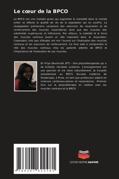 La BPCO est une maladie grave qui augmente la mortalité dans le monde entier et affecte la qualité de vie de la population qui en souffre. La réadaptation pulmonaire comprend des exercices de respiration et de renforcement des muscles respiratoires ainsi que des muscles des extrémités supérieures et inférieures. Par ailleurs, la stabilité et la force des muscles centraux jouent un rôle important dans la respiration. Cependant, très peu d'études ont mis l'accent sur l'évaluation des muscles centraux et les exercices de renforcement. Ce livre aide à comprendre le rôle des muscles centraux chez les patients atteints de BPCO et l'importance de l'évaluation de ces muscles.