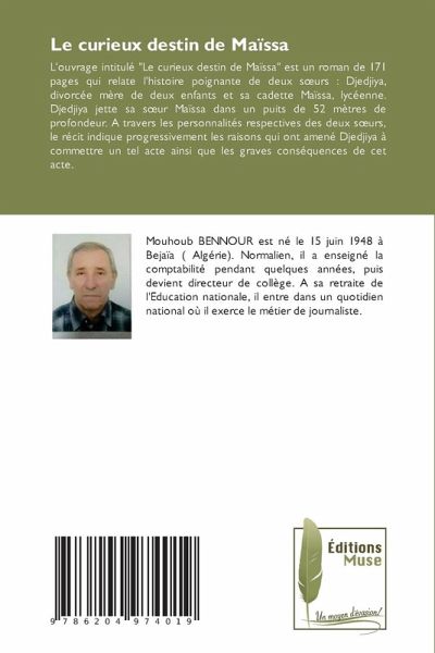 L'ouvrage intitulé "Le curieux destin de Maïssa" est un roman de 171 pages qui relate l'histoire poignante de deux soeurs : Djedjiya, divorcée mère de deux enfants et sa cadette Maïssa, lycéenne. Djedjiya jette sa soeur Maïssa dans un puits de 52 mètres de profondeur. A travers les personnalités respectives des deux soeurs, le récit indique progressivement les raisons qui ont amené Djedjiya à commettre un tel acte ainsi que les graves conséquences de cet acte.