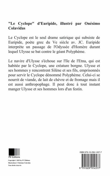 "Le Cyclope" d'Euripide, illustré par Onésimo Colavidas Le Cyclope est le seul drame satirique qui subsiste de Euripide, poète grec du Ve siècle av. JC. Euripide interprète un passage de l'Odyssée d'Homère durant lequel Ulysse se bat contre le géant Polyphème. Le navire d'Ulysse s'échoue sur l'île de l'Etna, qui est habitée par le Cyclope, une créature borgne. Ulysse et ses hommes y rencontrent Silène et ses fils, emprisonnés pour servir le Cyclope dénommé Polyphème. Celui-ci se nourrit de viande, de lait de chèvre et de fromage mais il est aussi anthropophage. Il peut donc à tout instant manger Ulysse et ses hommes lors d'un festin.