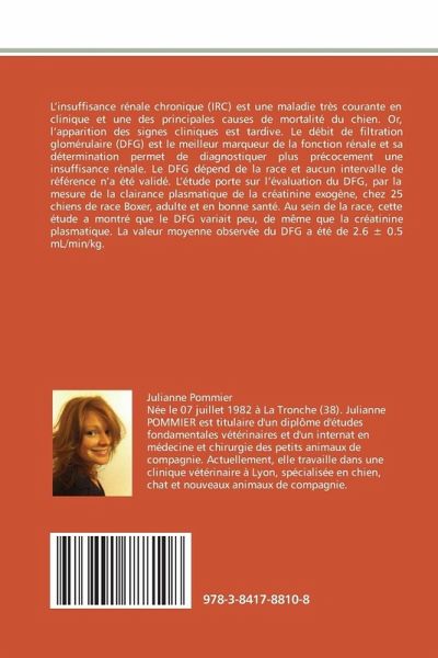 L insuffisance rénale chronique (IRC) est une maladie très courante en clinique et une des principales causes de mortalité du chien. Or, l apparition des signes cliniques est tardive. Le débit de filtration glomérulaire (DFG) est le meilleur marqueur de la fonction rénale et sa détermination permet de diagnostiquer plus précocement une insuffisance rénale. Le DFG dépend de la race et aucun intervalle de référence n a été validé. L étude porte sur l évaluation du DFG, par la mesure de la clairance plasmatique de la créatinine exogène, chez 25 chiens de race Boxer, adulte et en bonne santé. Au sein de la race, cette étude a montré que le DFG variait peu, de même que la créatinine plasmatique. La valeur moyenne observée du DFG a été de 2.6 ± 0.5 mL/min/kg.