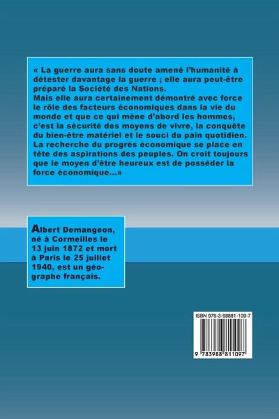 La guerre aura sans doute amené l'humanité à détester davantage la guerre ; elle aura peut-être préparé la Société des Nations. Mais elle aura certainement démontré avec force le rôle des facteurs économiques dans la vie du monde et que ce qui mène d'abord les hommes, c'est la sécurité des moyens de vivre, la conquête du bien-être matériel et le souci du pain quotidien. La recherche du progrès économique se place en tête des aspirations des peuples. On croit toujours que le moyen d'être heureux est de posséder la force économique...