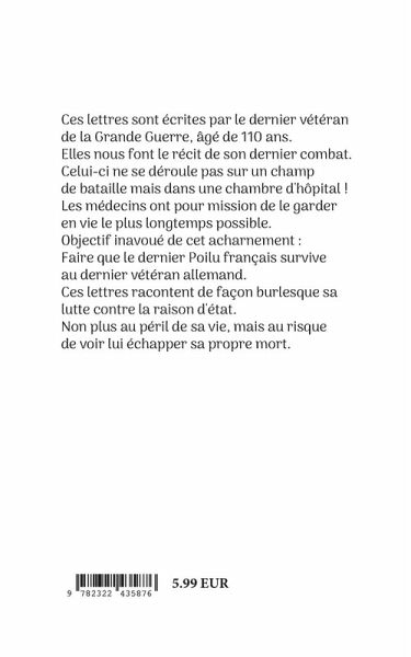 Ces lettres écrites par un poilu de la grande guerre nous font le récit de son dernier combat. Ce soldat est âgé de 110 ans ! Il est le dernier vétéran de l'armée française encore en vie.La guerre qu'il nous narre ne se déroule pas sur un champ de bataille, mais dans une chambre d'hôpital ! Il est hospitalisé contre son gré. Les médecins ont pour mission de le garder en vie le plus longtemps possible.Objectif inavoué de cet acharnement : faire que le dernier poilu français survive au dernier vétéran allemand.Désormais, les deux nations ne confrontent plus leurs puissances militaires, mais leurs systèmes de santé.Ces lettres racontent de façon burlesque ce combat qu'il doit livrer seul contre la raison d'état. Non plus au péril de sa vie, mais au risque de voir lui échapper sa propre mort.