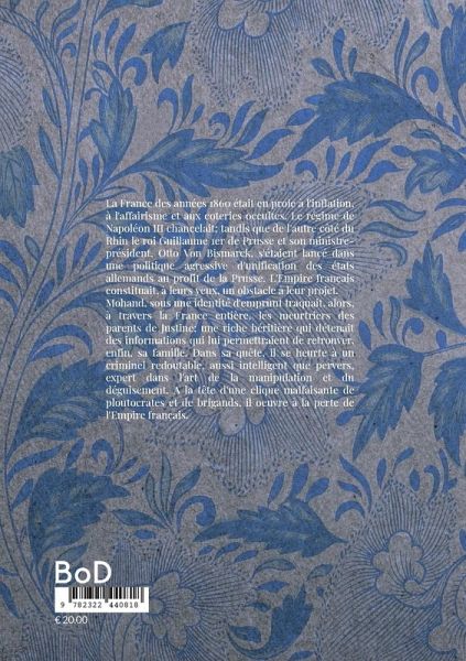 La France des années 1860 était en proie à l'inflation, à l'affairisme et aux coteries occultes. Le régime de Napoléon III chancelait; tandis que de l'autre côté du Rhin le roi Guillaume 1er de Prusse et son ministre-président, Otto Von Bismarck, s'étaient lancé dans une politique agressive d'unification des états allemands au profit de la Prusse. L'Empire français constituait, à leurs yeux, un obstacle à leur projet.Mohand, sous une identité d'emprunt traquait, alors, à travers la France entière, les meurtriers des parents de Justine; une riche héritière qui détenait des informations qui lui permettraient de retrouver, enfin, sa famille. Dans sa quête, il se heurte à un criminel redoutable, aussi intelligent que pervers, expert dans l'art de la manipulation et du déguisement. A la tête d'une clique malfaisante de ploutocrates et de brigands, il oeuvre à la perte de l'Empire français.