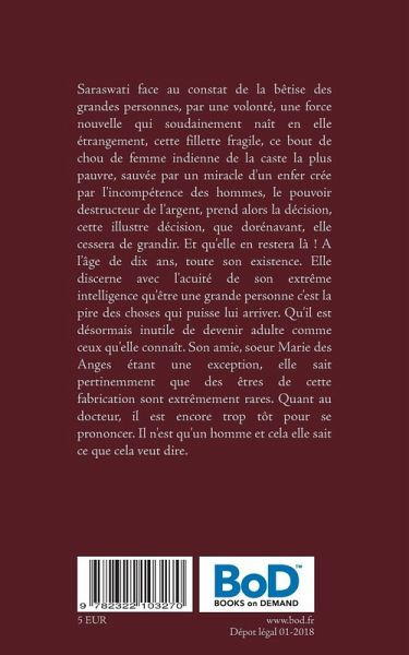 Saraswati face au constat de la bêtise des grandes personnes, par une volonté, une force nouvelle qui soudainement naît en elle étrangement, cette fillette fragile, ce bout de chou de femme indienne de la caste la plus pauvre, sauvée par un miracle d'un enfer crée par l'incompétence des hommes, le pouvoir destructeur de l'argent, prend alors la décision, cette illustre décision, que dorénavant, elle cessera de grandir. Et qu'elle en restera là ! A l'âge de dix ans, toute son existence. Elle discerne avec l'acuité de son extrême intelligence qu'être une grande personne c'est la pire des choses qui puisse lui arriver. Qu'il est désormais inutile de devenir adulte comme ceux qu'elle connaît. Son amie, soeur Marie des Anges étant une exception, elle sait pertinemment que des êtres de cette fabrication sont extrêmement rares. Quant au docteur, il est encore trop tôt pour se prononcer. Il n'est qu'un homme et cela elle sait ce que cela veut dire.
