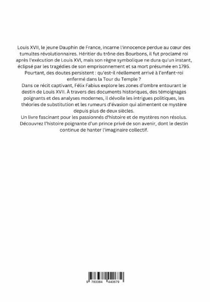 Louis XVII, le jeune Dauphin de France, incarne l'innocence perdue au coeur des tumultes révolutionnaires. Héritier du trône des Bourbons, il fut proclamé roi après l'exécution de Louis XVI, mais son règne symbolique ne dura qu'un instant, éclipsé par les tragédies de son emprisonnement et sa mort présumée en 1795. Pourtant, des doutes persistent : qu'est-il réellement arrivé à l'enfant-roi enfermé dans la Tour du Temple ?Dans ce récit captivant, Félix Fabius explore les zones d'ombre entourant le destin de Louis XVII. À travers des documents historiques, des témoignages poignants et des analyses modernes, il dévoile les intrigues politiques, les théories de substitution et les rumeurs d'évasion qui alimentent ce mystère depuis plus de deux siècles.Un livre fascinant pour les passionnés d'histoire et de mystères non résolus. Découvrez l'histoire poignante d'un prince privé de son avenir, dont le destin continue de hanter l'imaginaire collectif.