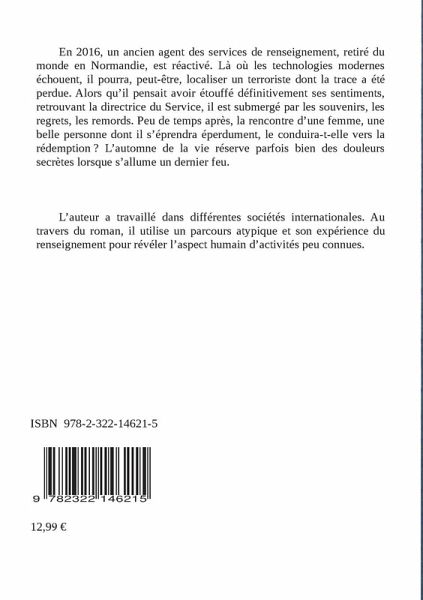 En 2016, un ancien agent des services de renseignement, retiré du monde en Normandie, est réactivé. Là où les technologies modernes échouent, il pourra, peut-être, localiser un terroriste dont la trace a été perdue. Alors qu'il pensait avoir étouffé définitivement ses sentiments, retrouvant la directrice du Service, il est submergé par les souvenirs, les regrets, les remords. Peu de temps après, la rencontre d'une femme, une belle personne dont il s'éprendra éperdument, le conduira-t-elle vers la rédemption ? L'automne de la vie réserve parfois bien des douleurs secrètes lorsque s'allume un dernier feu.