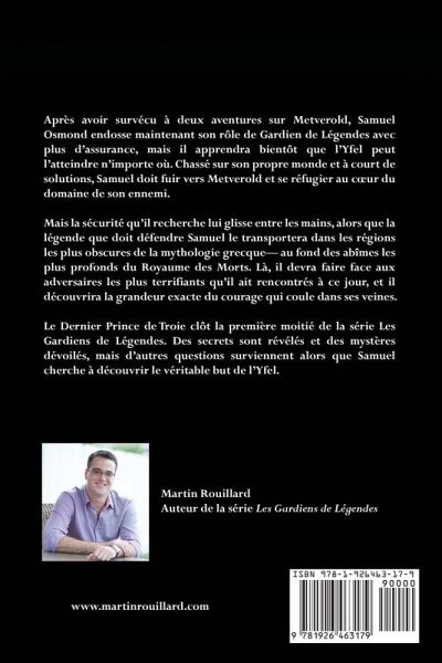 Après avoir survécu à deux aventures sur Metverold, Samuel Osmond endosse maintenant son rôle de Gardien de Légendes avec plus d’assurance, mais il apprendra bientôt que l’Yfel peut l’atteindre n’importe où. Chassé sur son propre monde et à court de solutions, Samuel doit fuir vers Metverold et se réfugier au cœur du domaine de son ennemi. Mais la sécurité qu’il recherche lui glisse entre les mains, alors que la légende que doit défendre Samuel le transportera dans les régions les plus obscures de la mythologie grecque— au fond des abîmes les plus profonds du Royaume des Morts. Là, il devra faire face aux adversaires les plus terrifiants qu’il ait rencontrés à ce jour, et il découvrira la grandeur exacte du courage qui coule dans ses veines. Le Dernier Prince de Troie clôt la première moitié de la série Les Gardiens de Légendes. Des secrets sont révélés et des mystères dévoilés, mais d’autres questions surviennent alors que Samuel cherche à découvrir le véritable but de l’Yfel.