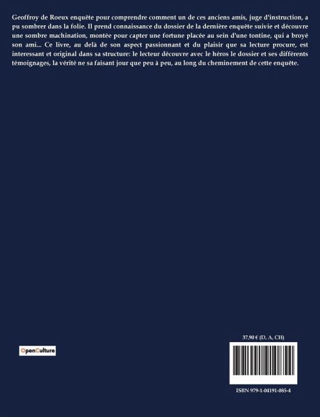Geoffroy de Roeux enquête pour comprendre comment un de ces anciens amis, juge d'instruction, a pu sombrer dans la folie. Il prend connaissance du dossier de la dernière enquête suivie et découvre une sombre machination, montée pour capter une fortune placée au sein d'une tontine, qui a broyé son ami... Ce livre, au delà de son aspect passionnant et du plaisir que sa lecture procure, est interessant et original dans sa structure: le lecteur découvre avec le héros le dossier et ses différents témoignages, la vérité ne sa faisant jour que peu à peu, au long du cheminement de cette enquête.