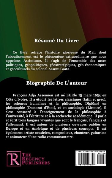 RESUME DU LIVRE Ce livre retrace l'histoire glorieuse du Mali dont l'aboutissement est le phénomène extraordinaire que nous appelons Assimisme. Il s'agit de l'ensemble des actes politiques, géopolitiques, géostratégiques, géo-économiques et géoculturels du colonel Assimi Goïta.