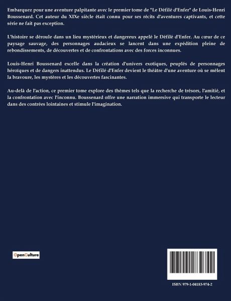 Embarquez pour une aventure palpitante avec le premier tome de "Le Défilé d'Enfer" de Louis-Henri Boussenard. Cet auteur du XIXe siècle était connu pour ses récits d'aventures captivants, et cette série ne fait pas exception. L'histoire se déroule dans un lieu mystérieux et dangereux appelé le Défilé d'Enfer. Au c¿ur de ce paysage sauvage, des personnages audacieux se lancent dans une expédition pleine de rebondissements, de découvertes et de confrontations avec des forces inconnues. Louis-Henri Boussenard excelle dans la création d'univers exotiques, peuplés de personnages héroïques et de dangers inattendus. Le Défilé d'Enfer devient le théâtre d'une aventure où se mêlent la bravoure, les mystères et les découvertes fascinantes. Au-delà de l'action, ce premier tome explore des thèmes tels que la recherche de trésors, l'amitié, et la confrontation avec l'inconnu. Boussenard offre une narration immersive qui transporte le lecteur dans des contrées lointaines et stimule l'imagination.