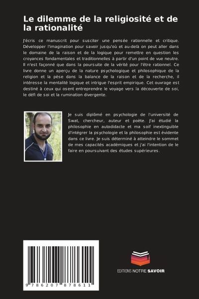 J'écris ce manuscrit pour susciter une pensée rationnelle et critique. Développer l'imagination pour savoir jusqu'où et au-delà on peut aller dans le domaine de la raison et de la logique pour remettre en question les croyances fondamentales et traditionnelles à partir d'un point de vue neutre. Il n'est façonné que dans la poursuite de la vérité pour l'être rationnel. Ce livre donne un aperçu de la nature psychologique et philosophique de la religion et la pèse dans la balance de la raison et de la recherche, il intéresse la mentalité logique et intrigue l'esprit empirique. Cet ouvrage est destiné à ceux qui osent entreprendre le voyage vers la découverte de soi, le défi de soi et la rumination divergente.