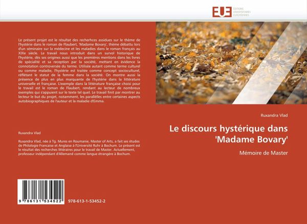 Le présent projet est le résultat des recherhces assidues sur le thème de l'hystérie dans le roman de Flaubert, 'Madame Bovary', thème débattu lors d'un séminaire sur la médecine et les maladies dans le roman français au XIXe siècle. Le travail nous introduit dans un survol historique de l'hystérie, dès ses origines aussi que les premières mentions dans les livres de spécialité et sa reception par la société, mettant en évidence la connotation controversée du terme. Utilisée autant comme terme culturel ou comme maladie, l'hystérie est traitée comme concept socioculturel, réflétant le statut de la femme dans la société. On montre aussi la présence de plus en plus marquante de l'hystérie dans la littérature universelle et française. L'exemple dans la littérature française choisi pour le travail est le roman de Flaubert, rendant au lecteur de nombreux exemples qui s'appuient sur le texte tel quel. Le travail finit par montrer au lecteur le but du projet, notamment, les parallèlles entre certaines aspects autobiographiques de l'auteur et la maladie d'Emma.