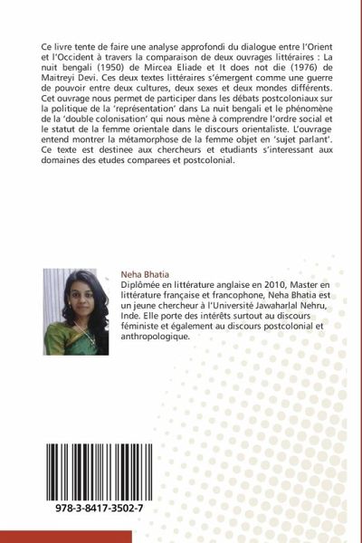 Ce livre tente de faire une analyse approfondi du dialogue entre l'Orient et l'Occident à travers la comparaison de deux ouvrages littéraires : La nuit bengali (1950) de Mircea Eliade et It does not die (1976) de Maitreyi Devi. Ces deux textes littéraires s'émergent comme une guerre de pouvoir entre deux cultures, deux sexes et deux mondes différents. Cet ouvrage nous permet de participer dans les débats postcoloniaux sur la politique de la 'représentation' dans La nuit bengali et le phénomène de la 'double colonisation' qui nous mène à comprendre l'ordre social et le statut de la femme orientale dans le discours orientaliste. L'ouvrage entend montrer la métamorphose de la femme objet en 'sujet parlant'. Ce texte est destinee aux chercheurs et etudiants s'interessant aux domaines des etudes comparees et postcolonial.