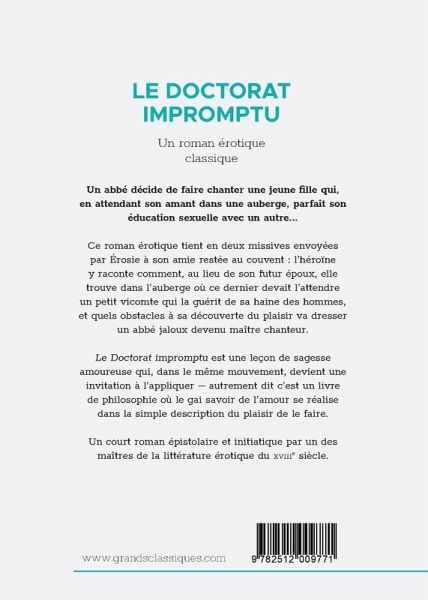 Un abbé décide de faire chanter une jeune fille qui, en attendant son amant dans une auberge, parfait son éducation sexuelle avec un autre... POUR UN PUBLIC AVERTI. Ce roman érotique tient en deux missives envoyées par Érosie à son amie restée au couvent : l¿héroïne y raconte comment, au lieu de son futur époux, elle trouve dans l¿auberge où ce dernier devait l¿attendre un petit vicomte qui la guérit de sa haine des hommes, et quels obstacles à sa découverte du plaisir va dresser un abbé jaloux devenu maître chanteur. Le Doctorat impromptu est une leçon de sagesse amoureuse qui, dans le même mouvement, devient une invitation à l¿appliquer ¿ autrement dit c¿est un livre de philosophie où le gai savoir de l¿amour se réalise dans la simple description du plaisir de le faire. Un court roman épistolaire et initiatique par un des maîtres de la littérature érotique du XVIIIe siècle. EXTRAIT Quand nous nous sommes séparées, ma chère Juliette, je t¿ai promis, et de bien bonne foi, de ne te cacher ni mes faiblesses, ni la moindre de leurs circonstances, si par malheur je venais à me pervertir. C¿est ainsi que je nommais très sérieusement le parti d¿abjurer, peut-être, certain système anti-masculin que tu m¿as connu, dont j¿étais orgueilleuse et dont tu ne cessais de me railler. La haine active que j¿avais conçue contre un sexe... selon moi si perfide, puisque trois de ses individus m¿avaient offensée, cette haine, que je croyais immortelle dans mon c¿ur, contrastant avec les délices dont me faisaient jouir nos tendresses féminines, je me persuadais que jamais animal au menton barbu ne viendrait à bout de m¿arracher la moindre faveur... Que j¿étais folle ! Trompe-t-on ainsi la nature ! Hélas ! Juliette, j¿ai violé mon serment. J¿ai cessé de brûler de cette flamme que je nommais pure, parce qüaucun homme ne l¿alimentait. J¿ai cessé d¿être, comme nous disions, une vestale mitigée ; et non seulement l¿homme, enfin, a profané mes vierges appas, mais du même saut dont je franchissais la barrière qüil m¿avait plu d¿opposer à mes mâles désirs, j¿ai fait une culbute effrayante dans le gouffre du plus blâmable dérèglement... À PROPOS DE L'AUTEUR Andréa de Nerciat (1739-1800) est un romancier français connu pour ses ¿uvres libertines simples et joyeuses : Félicia ou Mes Fredaines (1775), Le Doctorat impromptu (1788), Les Aphrodites (1793) ou encore apparu à titre posthume, Le Diable au corps (1803). Parallèlement à l'écriture, il embrasse une carrière militaire et diplomatique, qui l'emmène jusqu'à être colonel dans l'armée prussienne, agent secret et puis chambellan de la reine de Naples, Marie-Caroline. L'homme des lettres aurait même fréquenté des sociétés secrètes de libertinage, où il a puisé la matière de son ¿uvre. À PROPOS DE LA COLLECTION Retrouvez les plus grands noms de la littérature érotique dans notre collection Grands classiques érotiques. Autrefois poussés à la clandestinité et relégués dans « l'Enfer des bibliothèques », les auteurs de ces ¿uvres incontournables du genre sont aujourd'hui reconnus mondialement. Du Marquis de Sade à Alphonse Momas et ses multiples pseudonymes, en passant par le lyrique Alfred de Musset ou la féministe Renée Dunan, les Grands classiques érotiques proposent un catalogue complet et varié qui contentera tant les novices que les connaisseurs.