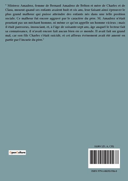 " Mistress Amadroz, femme de Bernard Amadroz de Belton et mère de Charles et de Clara, mourut quand ses enfants avaient huit et six ans, leur faisant ainsi éprouver le plus grand malheur qui puisse atteindre des enfants nés dans une telle position sociale. Ce malheur fut encore aggravé par le caractère du père. M. Amadroz n¿était pourtant pas un méchant homme, ni même ce qüon appelle un homme vicieux ; mais il était paresseux, insouciant, et, à l¿âge de soixante-sept ans, âge auquel le lecteur fait sa connaissance, il n¿avait encore fait aucun bien en ce monde. Il avait fait un grand mal, car son fils Charles s¿était suicidé, et cet affreux événement avait été amené en partie par l¿incurie du père."