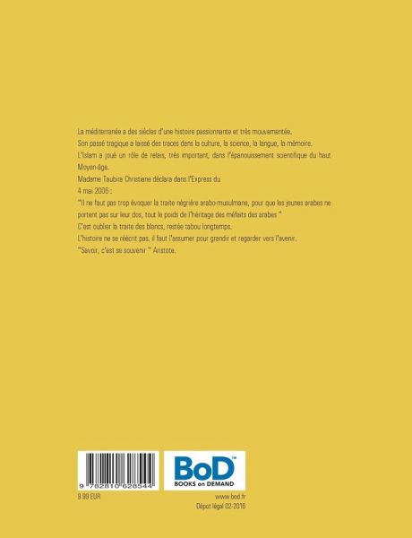 La méditerranée a des siècles d'une histoire passionnante et très mouvementée.Son passé tragique a laissé des traces dans la culture, la science, la langue, la mémoire.L'Islam a joué un rôle de relais, très important, dans l'épanouissement scientifique du haut Moyen-âge.Madame Taubira Christiane déclara dans l'Express du4 mai 2006 :"Il ne faut pas trop évoquer la traite négrière arabo-musulmane, pour que les jeunes arabes ne portent pas sur leur dos, tout le poids de l'héritage des méfaits des arabes "C'est oublier la traite des blancs, restée tabou longtemps.L'histoire ne se réécrit pas. il faut l'assumer pour grandir et regarder vers l'avenir."Savoir, c'est se souvenir " Aristote.