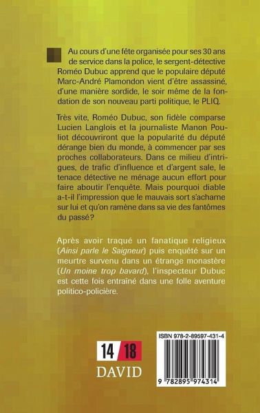 Au cours d'une fête organisée pour ses 30 ans de service dans la police, le sergent-détective Roméo Dubuc apprend que le populaire député Marc-André Plamondon vient d'être assassiné, d'une manière sordide, le soir même de la fondation de son nouveau parti politique, le PLIQ. Très vite, Roméo Dubuc, son fidèle comparse Lucien Langlois et la journaliste Manon Pouliot découvriront que la popularité du député dérange bien du monde, à commencer par ses proches collaborateurs. Dans ce milieu d'intrigues, de trafic d'influence et d'argent sale, le tenace détective ne ménage aucun effort pour faire aboutir l'enquête. Mais pourquoi diable a-t-il l'impression que le mauvais sort s'acharne sur lui et qu'on ramène dans sa vie des fantômes du passé?