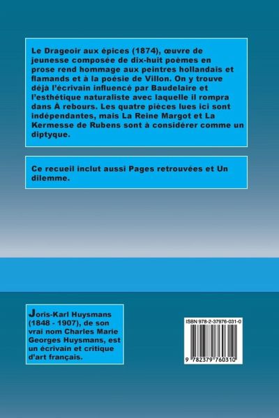 Le Drageoir aux épices (1874), œuvre de jeunesse composée de dix-huit poèmes en prose rend hommage aux peintres hollandais et flamands et à la poésie de Villon. On y trouve déjà l'écrivain influencé par Baudelaire et l'esthétique naturaliste avec laquelle il rompra dans À rebours. Les quatre pièces lues ici sont indépendantes, mais La Reine Margot et La Kermesse de Rubens sont à considérer comme un diptyque. Ce recueil inclut aussi Pages retrouvées et Un dilemme.