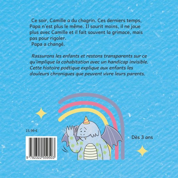 Ce soir, Camille a du chagrin. Ces derniers temps, Papa n'est plus le même. Il sourit moins, il ne joue plus avec Camille et il fait souvent la grimace, mais pas pour rigoler. Rassurons les enfants et restons transparents sur ce qu'implique la cohabitation avec un handicap invisible. Cette histoire poétique explique aux enfants les douleurs chroniques que peuvent vivre leurs parents.