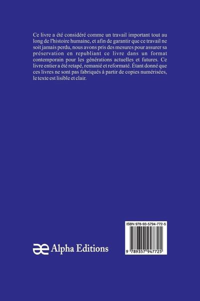 Le Dragon Impérial, est un livre classique et rare, qui a été considéré comme important tout au long de l'histoire de l'humanité, et pour que cet ouvrage ne soit jamais oublié, chez Alpha Editions, nous avons fait des efforts pour sa préservation en rééditant ce livre dans un format moderne pour les générations présentes et futures. . Tout ce livre a été reformaté, retapé et repensé. Ces livres ne sont pas constitués de copies numérisées de leur ¿uvre originale et leur texte est donc clair et lisible. Ce livre remarquable s'inscrit dans les genres de Language and Literatures, Romance literatures