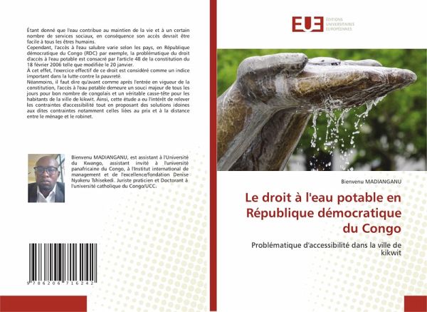 Étant donné que l'eau contribue au maintien de la vie et à un certain nombre de services sociaux, en conséquence son accès devrait être facile à tous les êtres humains.Cependant, l'accès à l'eau salubre varie selon les pays, en République démocratique du Congo (RDC) par exemple, la problématique du droit d'accès à l'eau potable est consacré par l'article 48 de la constitution du 18 février 2006 telle que modifiée le 20 janvier.À cet effet, l'exercice effectif de ce droit est considéré comme un indice important dans la lutte contre la pauvreté.Néanmoins, il faut dire qu'avant comme après l'entrée en vigueur de la constitution, l'accès à l'eau potable demeure un souci majeur de tous les jours pour bon nombre de congolais et un véritable casse-tête pour les habitants de la ville de kikwit. Ainsi, cette étude a eu l'intérêt de relever les contraintes d'accessibilité tout en proposant des solutions idoines aux dites contraintes notamment celles liées au prix et à la distance entre le ménage et le robinet.