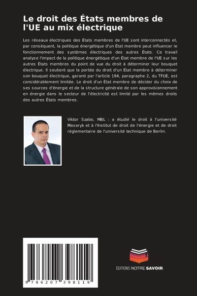 Les réseaux électriques des États membres de l'UE sont interconnectés et, par conséquent, la politique énergétique d'un État membre peut influencer le fonctionnement des systèmes électriques des autres États. Ce travail analyse l'impact de la politique énergétique d'un État membre de l'UE sur les autres États membres du point de vue du droit à déterminer leur bouquet électrique. Il soutient que la portée du droit d'un État membre à déterminer son bouquet électrique, garanti par l'article 194, paragraphe 2, du TFUE, est considérablement limitée. Le droit d'un État membre de décider du choix de ses sources d'énergie et de la structure générale de son approvisionnement en énergie dans le secteur de l'électricité est limité par les mêmes droits des autres États membres.