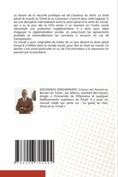 Le besoin de la sécurité juridique est de l'essence du droit. Le droit pénal du travail au Tchad et au Cameroun s'inscrit dans cette logique. Il est une discipline intermédiaire entre le droit pénal et le droit du travail, qui a vu le jour dès le XIXe siècle à un moment où l'ordre social nécessitait une protection supplémentaire. Il a donc pour objet d'appuyer la réglementation sociale, en prescrivant les agissements prohibés et éventuellement les sanctions à encourir en cas de transgression.Ce travail a pour originalité de traiter de ce que devient le droit pénal lorsqu'il s'infiltre dans le monde social, pour dire en droit du travail. Ce dernier s'est avéré particulier et ce, de l'incrimination à la répression en passant par la procédure.